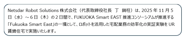福岡市で、「Fukuoka Smart East」をテーマとした先進的なまちづくりの一環として、Netsdar Robot Solutions株式会社(以下、Netsdar)をはじめ、エヌ・ティ・ティ・データCCS、オプテックス、そして日本オーチス・エレベータの4社による共同体が、ロボットを用いたスマートエントランスシステムの実証実験を行います。この取り組みは、集合住宅における宅配サービスを効率化し、未来の業界の課題解決に寄与することを目的としています。
