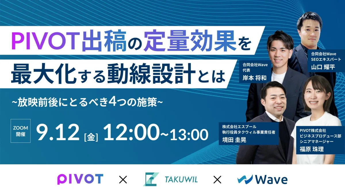 2025年9月12日金曜日、PIVOT社がエスプール社およびWave社と共催で、オンラインウェビナー「PIVOT出稿の"定量効果"を最大化する動線設計とは」を開催します。このウェビナーは、広告出稿を効果的に行いたい方にとって見逃せない機会です。