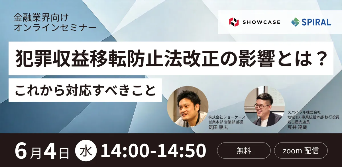 スパイラル株式会社と株式会社ショーケースは、2025年6月4日(水)に「犯罪収益移転防止法改正の影響とは?これから対応すべきこと」と題したオンラインセミナーを共催します。本セミナーでは、犯罪収益移転防止法の改正内容や、企業がどのように対応すべきかを詳しく解説します。
