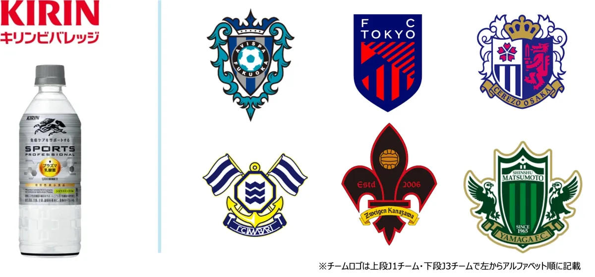 新たに採用されたのは、J1に所属する「アビスパ福岡」、「FC東京」、「セレッソ大阪」、J3に所属する「FC今治」、「ツエーゲン金沢」、「松本山雅FC」の6チームです。今後、これらのクラブでは、所属選手の免疫ケアを目的として、練習やイベント時に「キリン スポーツ プロフェッショナル」が提供される予定です。