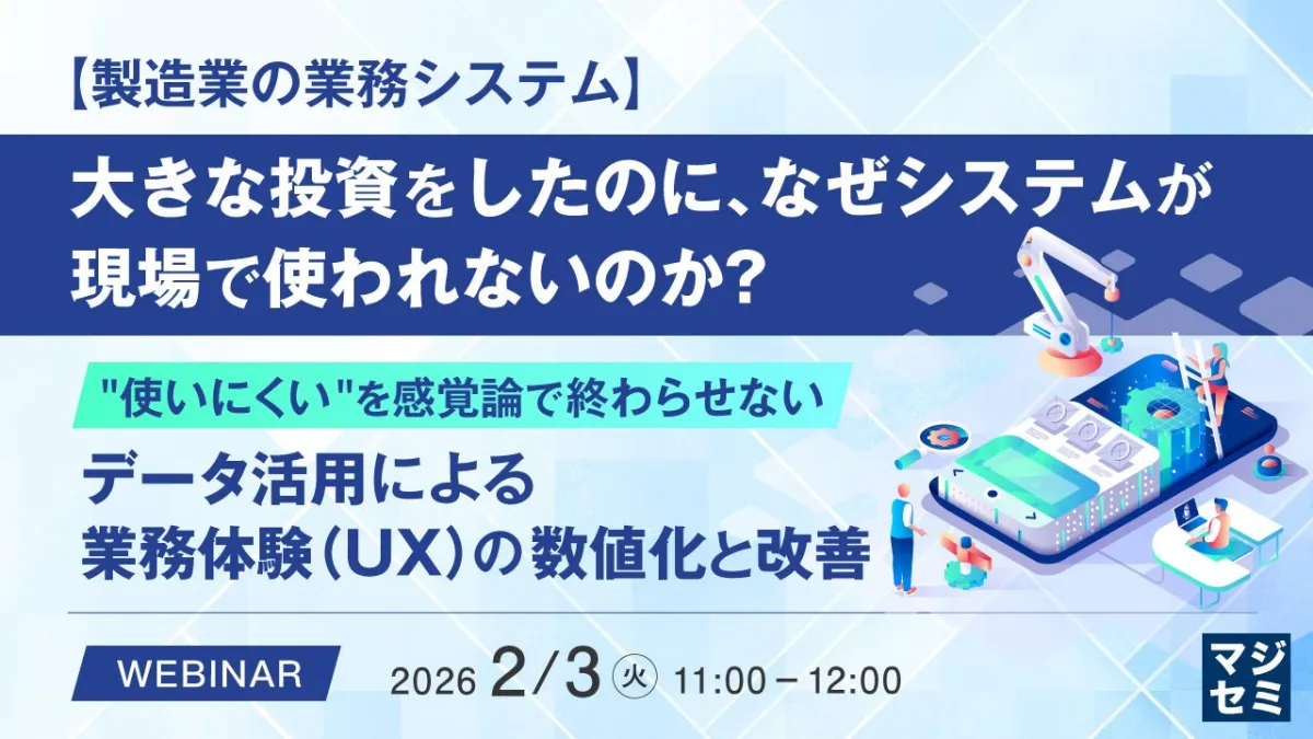 本ウェビナーでは、 利用者のインタビューや現場観察、そしてシステムログの分析を通じ、業務体験を数値化する手法について解説します。数値化によって「使いにくい」要因を明確にし、改善案として提案することで、経営層に対する説得力ある資料を作成できます。また、見直された業務プロセスは、現場改善とともに、投資対効果の向上にも寄与するでしょう。