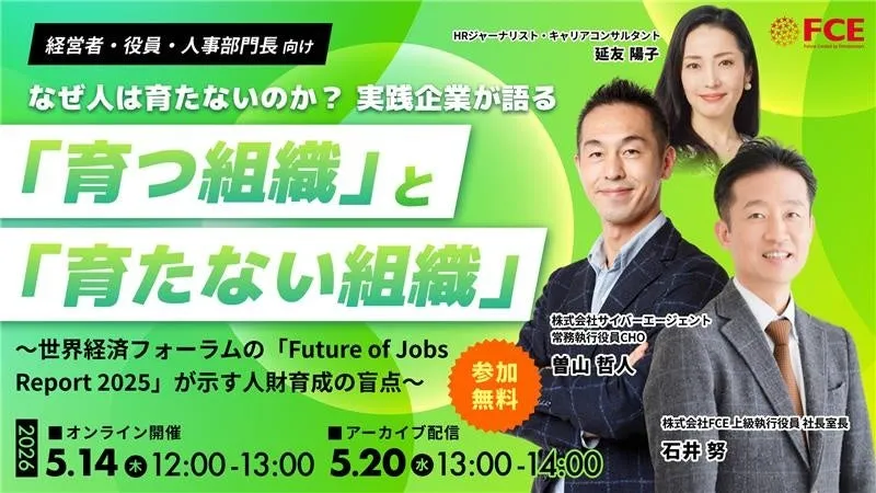 株式会社FCEは、2026年5月14日(木)に無料オンラインイベント「なぜ人は育たないのか? 実践企業が語る『育つ組織』と『育たない組織』」を開催します。今回のイベントでは、サイバーエージェントの常務執行役員CHO、曽山哲人氏を招き、パネルディスカッション形式で人財育成の壁と解決策を考えます。さらに、HRジャーナリストの延友陽子氏がファシリテーターとして参加します。