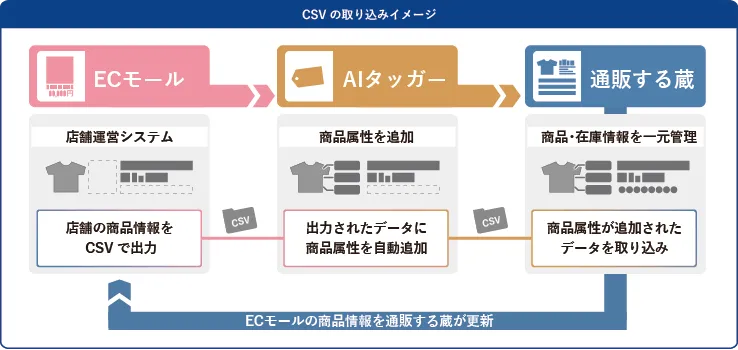 これまで、「AIタッガー」が提供するECモールで使用されるフォーマット(例:CSVファイル)は、「通販する蔵」に登録するためには専用フォーマットへの再加工が必要でした。しかし、新たな機能が追加されることで、これらのフォーマットを再加工せず、そのまま取り込むことができるようになりました。