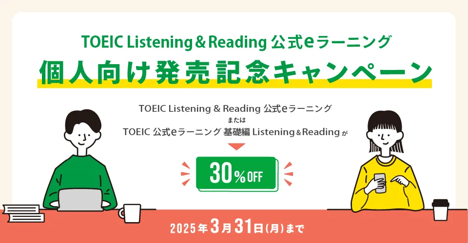 新製品の発売に合わせ、2025年3月3日から3月31日までの期間に新規で『TOEIC Listening & Reading 公式eラーニング』またはその基礎編を購入すると、30%割引の特典が得られます。割引の適用には専用のクーポンコードの入力が必要です。
