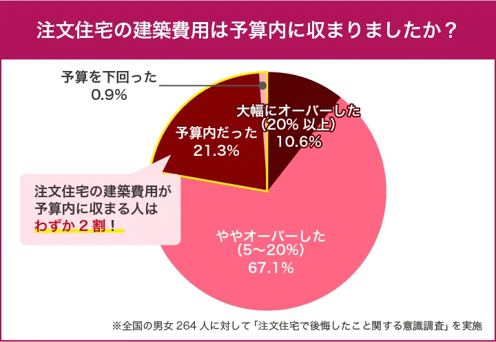 注文住宅の購入は、生涯で一度の大きな買い物であるため、事前の計画と資金準備が重要です。しかし、アンケートの結果によると、建築費用が予算内に収まったという回答は2割に満たず、驚くべきことに77.7%の人が予算を超過してしまったことを示しています。具体的には、「20%以上オーバーした」と答えた人が10.6%、また「5〜20%オーバーした」との回答が67.1%を占めました。