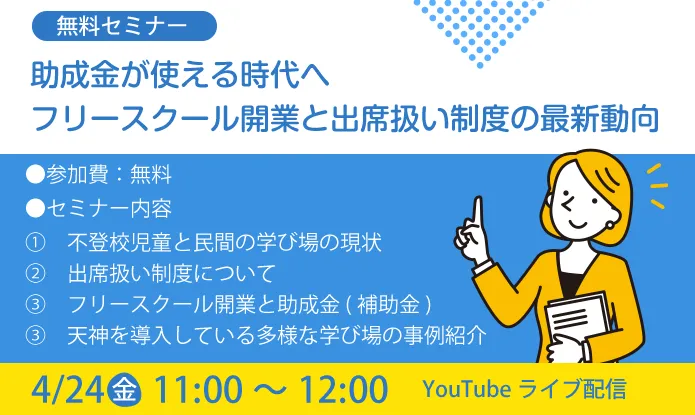 このセミナーは、2026年4月24日(金)に開催され、主にフリースクールの開業に必要な助成金や補助金、出席扱い制度などの最新情報が解説されます。これまでのセミナーでも多くの参加者から関心を集め、情報が求められていることを実感しています。