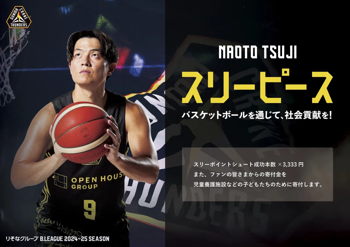 2024-25シーズン、群馬クレインサンダーズの辻直人選手は、ホームゲーム時に行った社会貢献活動「スリーピース」の募金活動を報告しました。辻選手はこの活動を通じて、合計782,818円を集め、群馬県立小児医療センターに寄付しました。