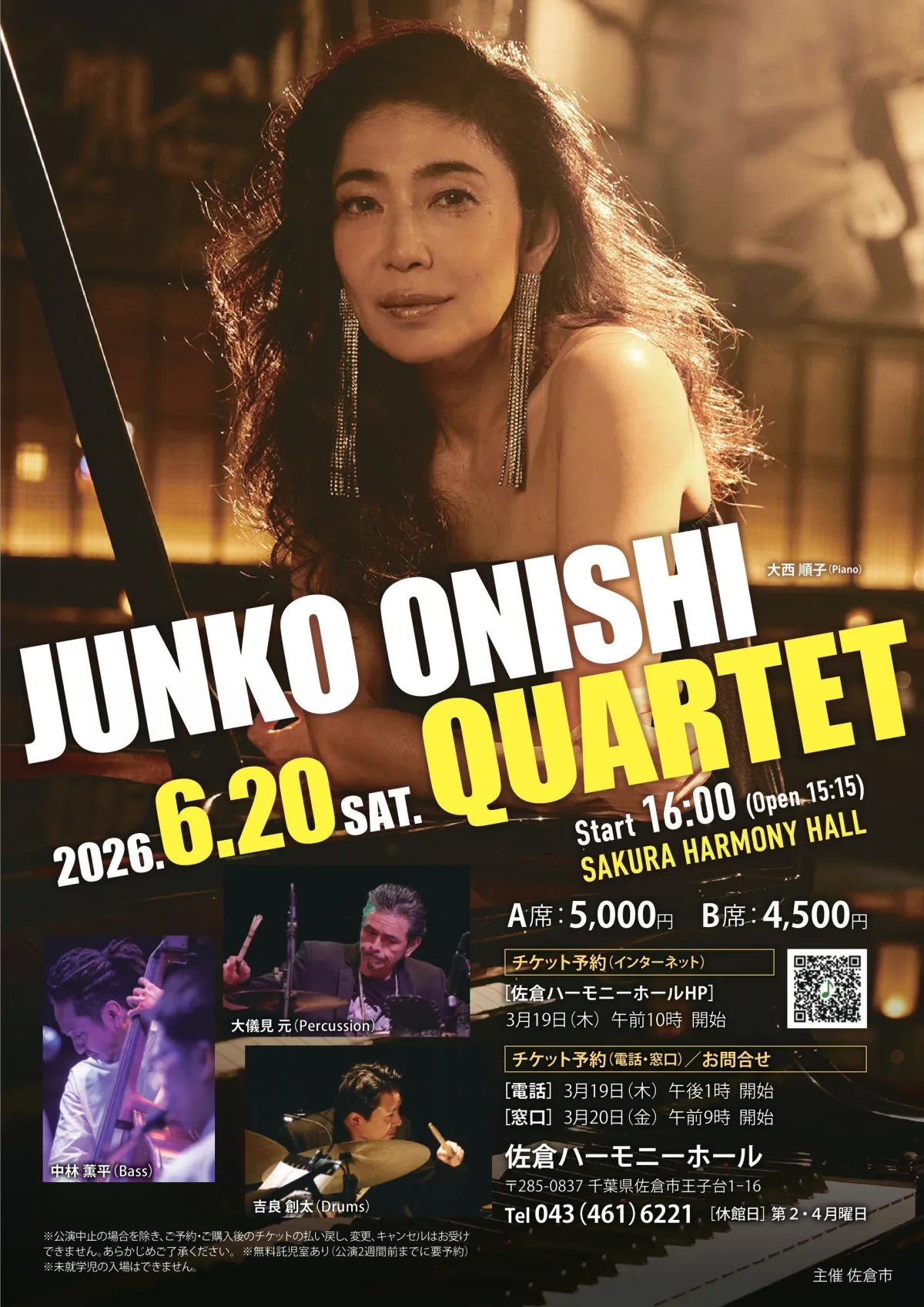 世界的に評価されているピアニスト、大西順子が2020年12月に始動させた「大西順子カルテット」。音楽ファンが待望するライブが、2026年6月20日(土)に千葉県佐倉市の佐倉ハーモニーホールで開催されます。今回は、その魅力と楽しみ方をお伝えします。