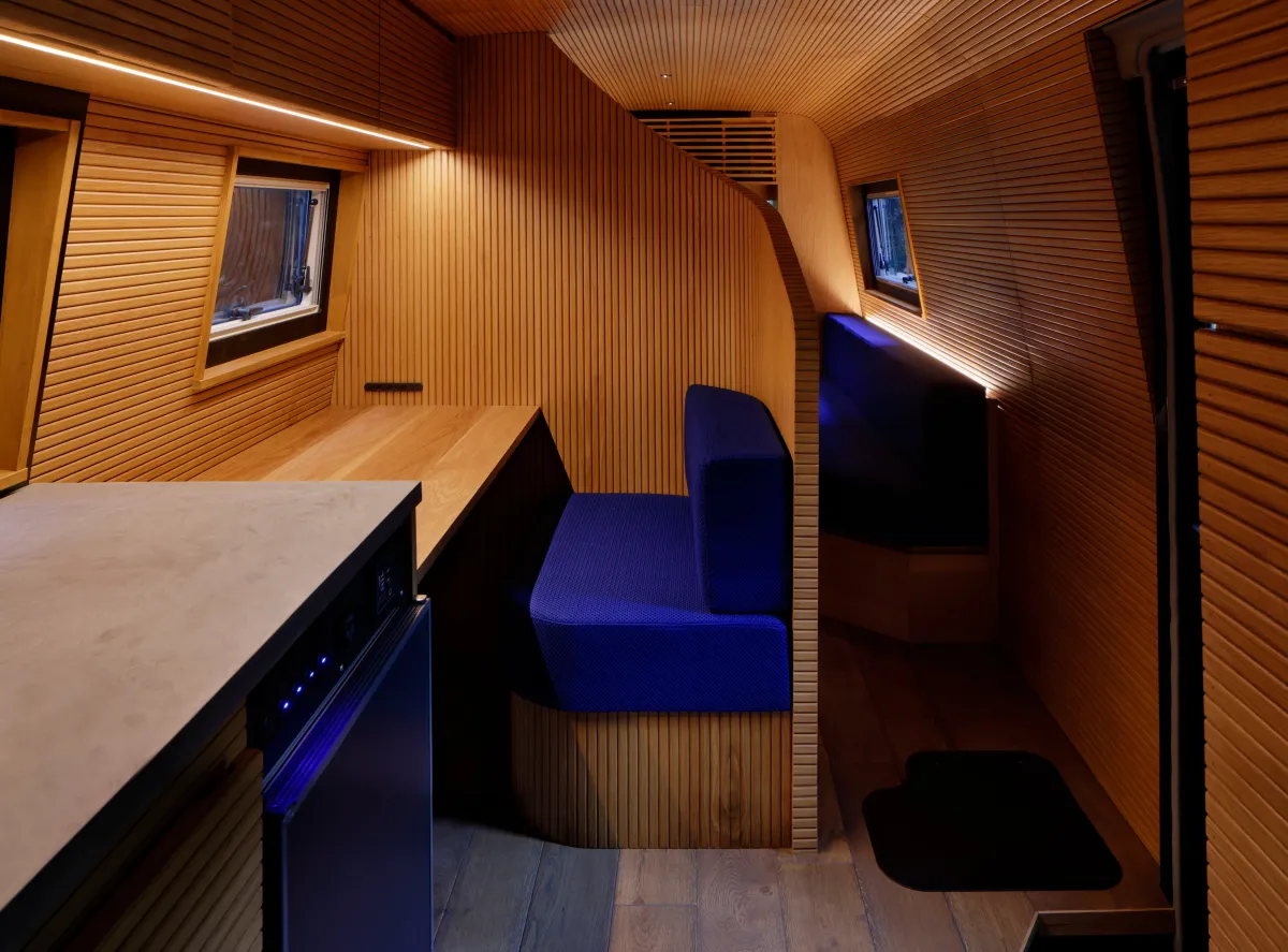 今年の注目は、世界3大デザイン賞の一つである「iFデザインアワード2023」を受賞したサロンカーの初展示です。中古マイクロバスをリノベーションしたこのサロンカーは、ミニキッチン、デスクスペース、34インチモニターとエアコン付きミーティングスペースを備え、車内全面に施された木製のルーバーが、移動オフィスとしての機能性と快適な空間を両立させています。