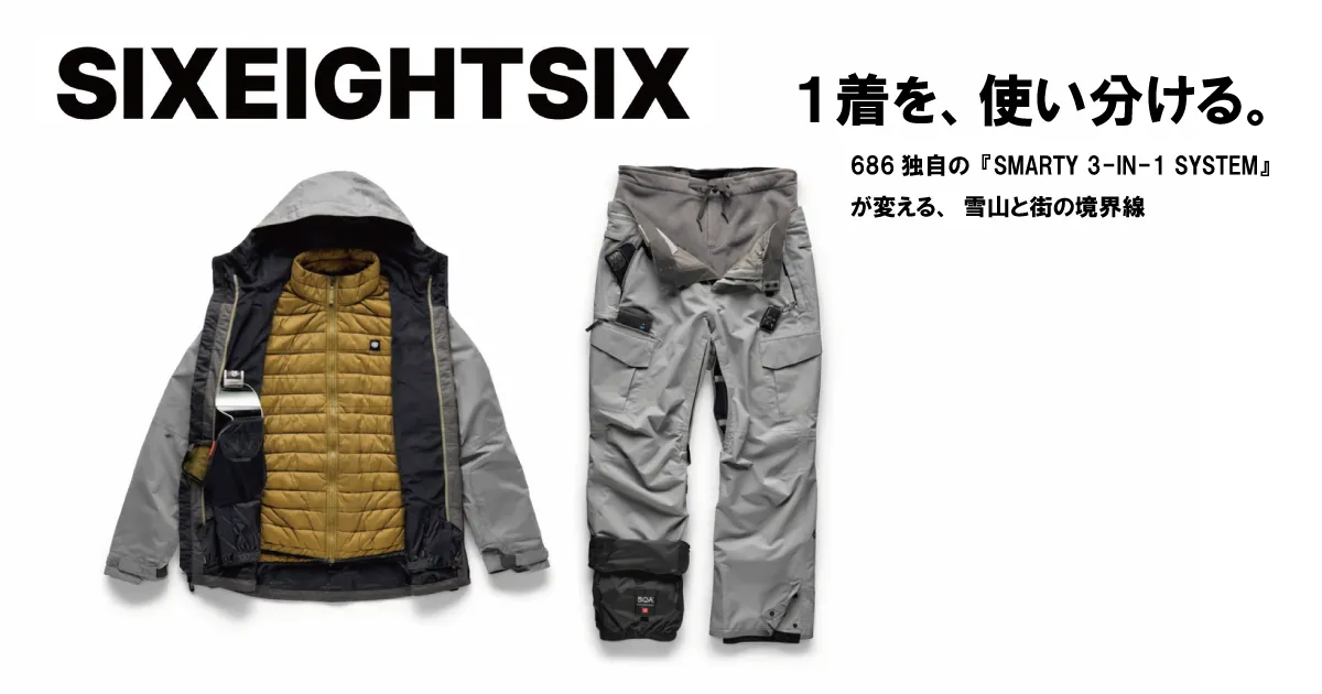686が20年以上の歴史を誇る「SMARTY 3-IN-1 SYSTEM」は、雪山と街の境界を曖昧にする革新的なウェアシステムです。シェルとインナーを組み合わせることで、着るシーンやコンディションに応じて、1着で3通りのスタイルを楽しむことが可能となります。春先のハイキングや日常使い、さらに厳冬期の雪山まで、このシステムが一手に引き受けるのです。