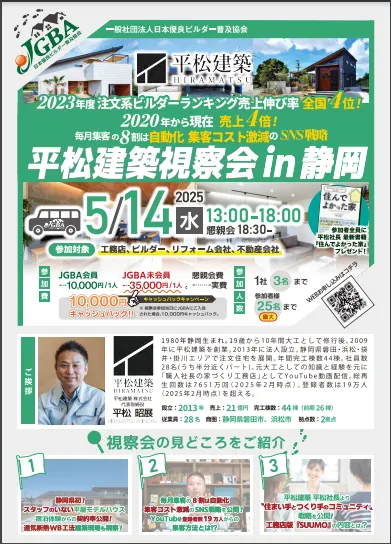 2025年5月14日(水)、静岡県にて「平松建築視察会」が開催されます。このイベントは一般社団法人日本優良ビルダー普及協会(JGBA)が主催し、全国から工務店、住宅会社が参加する予定です。視察は名門の平松建築株式会社が運営する施設を中心に行われ、業界での知識と実践を深める絶好の機会です。