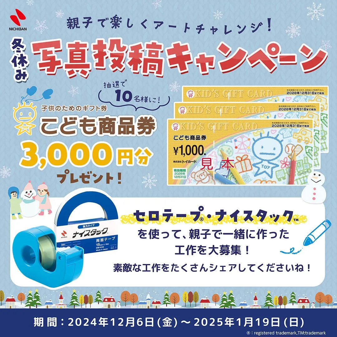 冬休みを親子で楽しむこのキャンペーンに参加し、楽しい工作の思い出をシェアしましょう。ニチバンのセロテープ®とナイスタック(TM)とともに、特別なひとときを過ごす素敵な機会です。お子さんの創造力を引き出し、楽しい作品を作ってみてはいかがでしょうか!