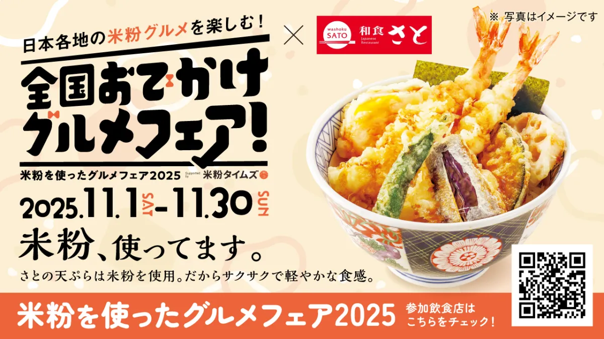 和食ファミリーレストラン「和食さと」が、2025年11月1日(土)から30日(日)まで、全国のお客様を対象に「日本各地の米粉グルメを楽しむ!全国おでかけグルメフェア」を開催します。このイベントは、米・米粉消費拡大推進プロジェクトの一環として実施され、国内での米粉の消費を促進することに寄与します。