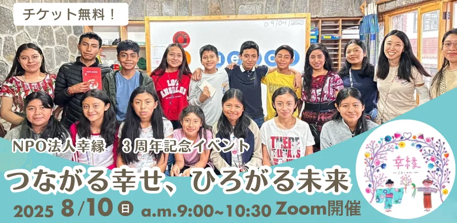 NPO法人幸縁は、中米のグアテマラにて、教育支援を行う非営利団体です。このたび、私たちの活動が3年を迎えたことを記念し、「つながる幸せ、ひろがる未来」というテーマのもと、特別なオンラインイベントを開催する運びとなりました。幼いころから困難な状況にある子どもたちに、教育の重要性を伝え、将来への希望を持ってもらうために、私たちがどのように貢献してきたのかを皆様と共に振り返り、今後の展望を語る機会となります。