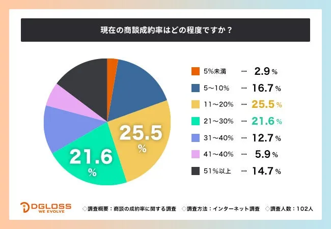 最初の発見として、成約率が20%以下であると回答した人が約半数を占め、その中でも特に11〜20%の層が最も多く、全体の25.5%にも上ります。このことはすなわち、10件の商談のうち、たった2件しか成約に至らない現状を示しています。一方、高い成約率を誇る回答者はわずかに14.7%しかおらず、多くの営業担当者が苦しんでいる状況がうかがえます。