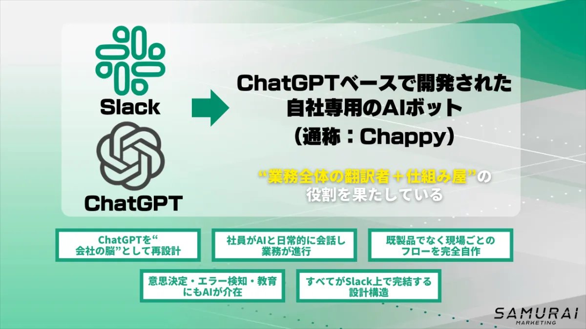 SAMURAIマーケティングは、少人数のチームで複数の事業を展開している企業です。その中で、Slackは日々のコミュニケーションや業務管理の中心的なツールとして位置付けられています。しかし、Slack上の会話が流れていくうちに、目標との乖離や同じ問題の繰り返しが目立つようになりました。これに対する解決策として、AIを活用し、コミュニケーションの“ズレ”を補正することが必要であると感じたのが「Chappy」の誕生のきっかけです。AIが組織の思考を支援することで、業務の精度が向上し、よりスムーズな前進が可能になると考えています。