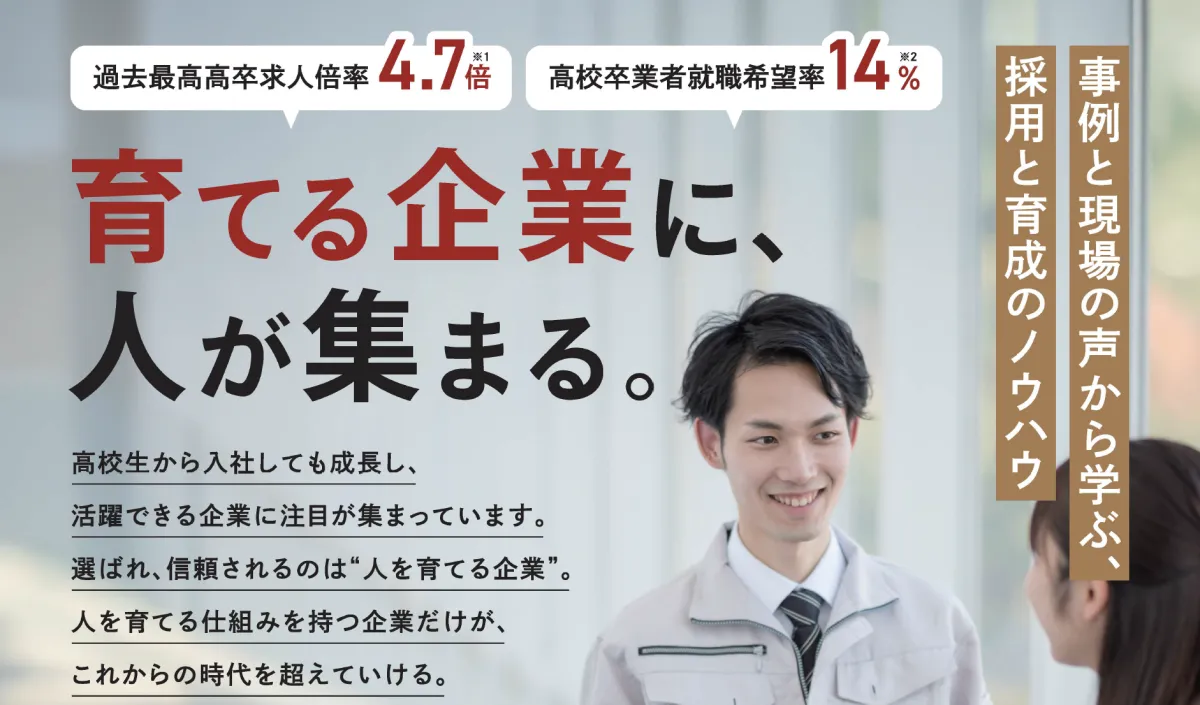 このセミナーは、高卒採用を計画している企業や、若手社員の育成に難しさを感じている企業を対象に、教育現場の貴重な声とデータに基づいた採用および育成を学ぶことができる機会です。