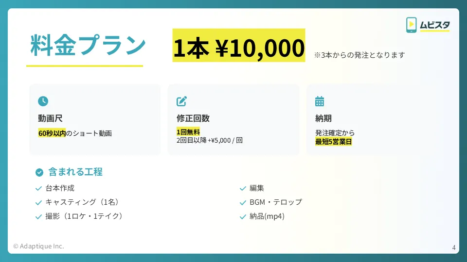 「ムビスタ」は、1本あたりたったの1万円(税別)からショート動画を制作可能です。こちらのサービスでは、撮影からキャスティング、台本作成、編集に至るまで、すべてをワンストップで行います。そのため、手間をかけずに60秒以内の縦型動画を短期間で手に入れることができるのです。これにより、広告代理店や事業会社は、長い納期を待たされることなく、迅速にクリエイティブを制作できるようになります。
