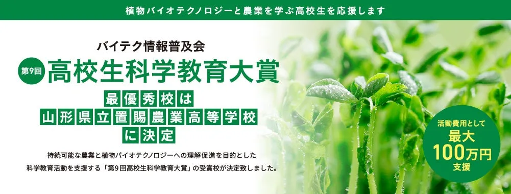 このアワードは、バイテク情報普及会が主催し、高校生が植物バイオテクノロジーや持続可能な農業に関する活動を支援することを目的としています。2017年の創設以来、次世代を担う学生たちがバイオテクノロジーの学びを深めることで、持続可能な農業や食料問題に向き合う力を育てています。毎年、全国の高等学校から応募があり、受賞校には最大100万円の活動費が提供されています。