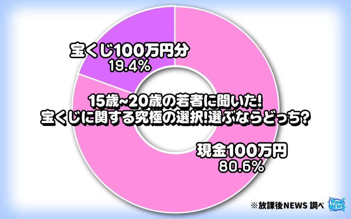 「放課後NEWS」が実施した調査によると、「宝くじ100万円分をもらうか、現金100万円をもらうか」という究極の選択において、なんと80.6%の若者が現金を選択しました。この結果には、彼らの「現実的」な価値観が色濃く反映されています。