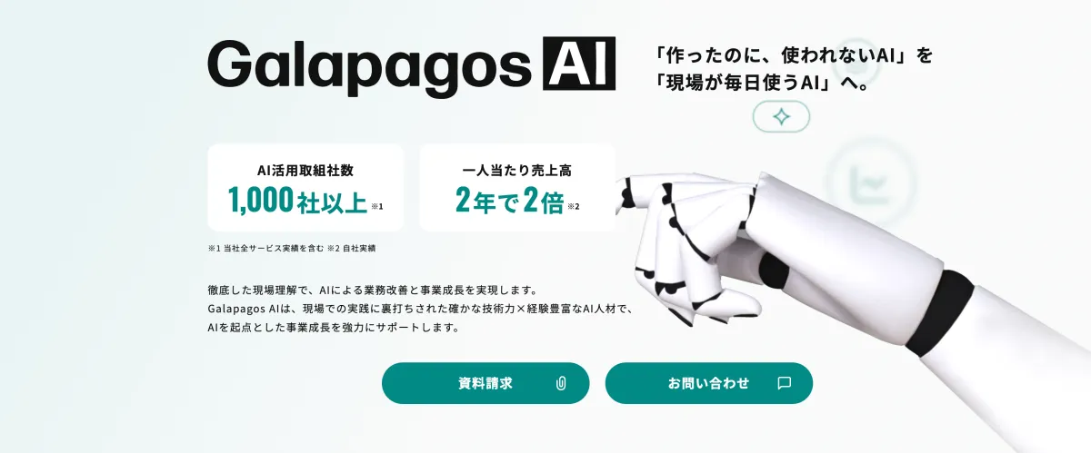 ガラパゴスは、15年以上におよぶアプリケーション開発の経験を持ち、AI×デザインの分野で1,000社以上の企業を支援してきた実績があります。特に、自社でも約2年前から生成AIの導入を行い、実務におけるビッグデータの活用を実践してきました。その結果、1人あたりの売上高を200%向上させ、20,000時間以上の業務にかかる時間を短縮するという成功を収めています。このような実績を元にして、今度は外部企業へのAIトランスフォーメーション(AX)を支援することにフォーカスを移しました。