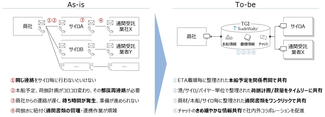 TGIでは、商社とサイロ会社間での情報連携時間を削減するために、以下のような機能が用意されています。