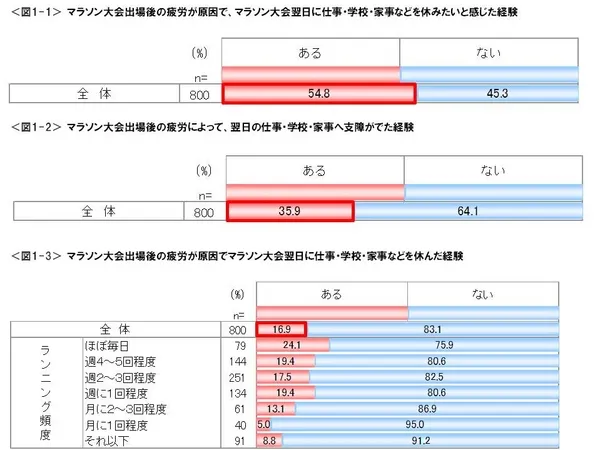 調査結果によると、マラソンによる疲労が原因で「休みたい」と感じたランナーが54.8%にも達しています。また、実際に休んだことがあると回答したのは16.9%で、特に普段からよく走る人にその傾向が見られました。これは、マラソンの疲れからくるパフォーマンスの低下が懸念される結果です。