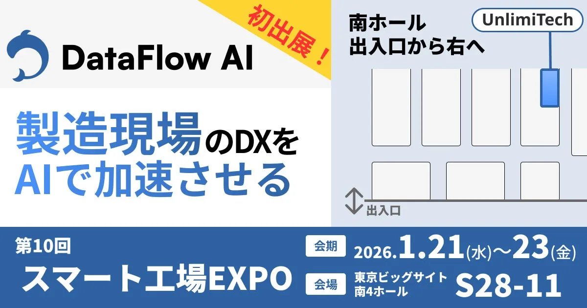 『DataFlow AI』は、2026年1月21日から23日まで東京ビッグサイトで開催される「第10回 スマート工場 EXPO」において初めて公開されます。ブースS28-11では、実際にこのツールを体験できるライブデモが行われ、現場業務のAI自動化がどのように実現されるのかを目の当たりにすることができます。