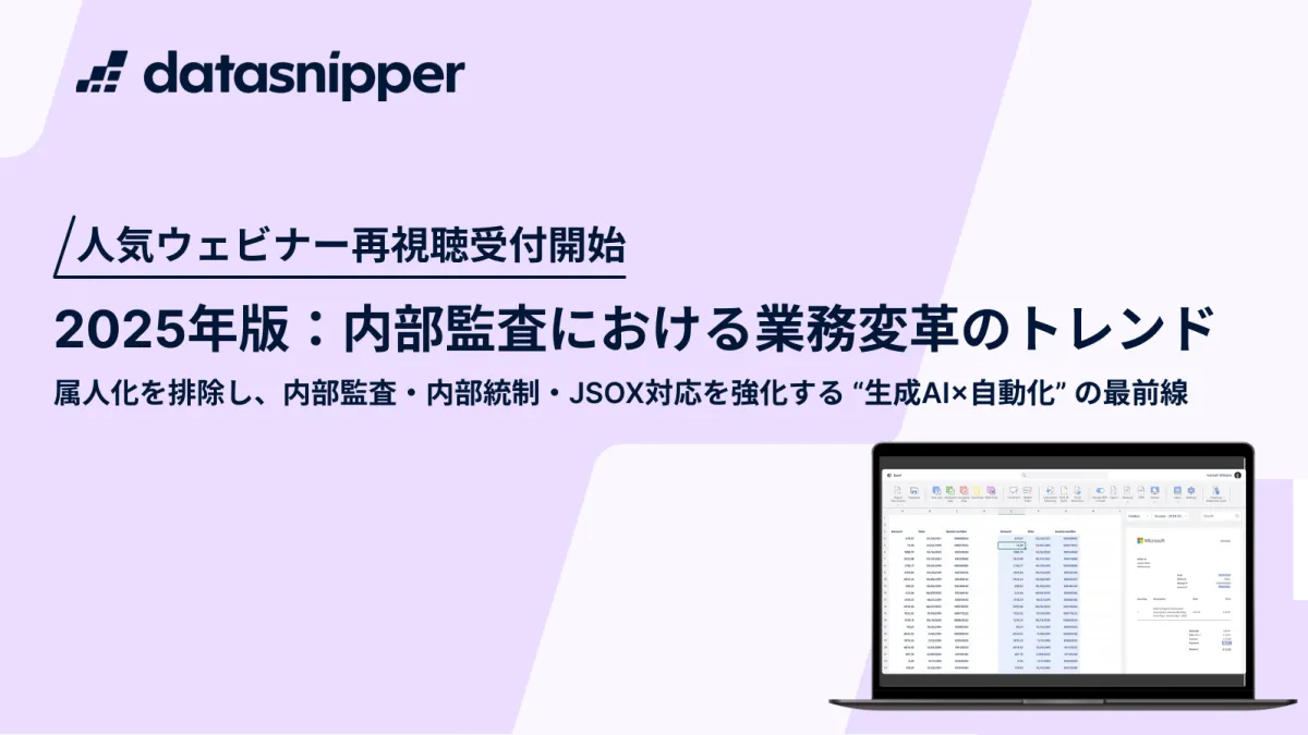 SwiftLink株式会社が提供するDataSnipper B.V.は、監査業務におけるDX(デジタルトランスフォーメーション)をテーマにしたウェビナーをオンデマンドで配信しています。このウェビナーは、特に内部監査の分野において、近年の業務変革やAIの活用トレンドに焦点をあてています。