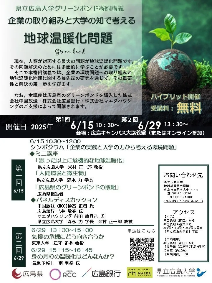 この寄附講義は、2つの回に分かれて開催されます。第1回目の日時は令和7年6月15日(日)10:30から12:00までで、場所は県立広島大学の広島キャンパス大講義室です。今回は「企業の実践と大学の力から考える環境問題」をテーマにしたシンポジウムが行われます。