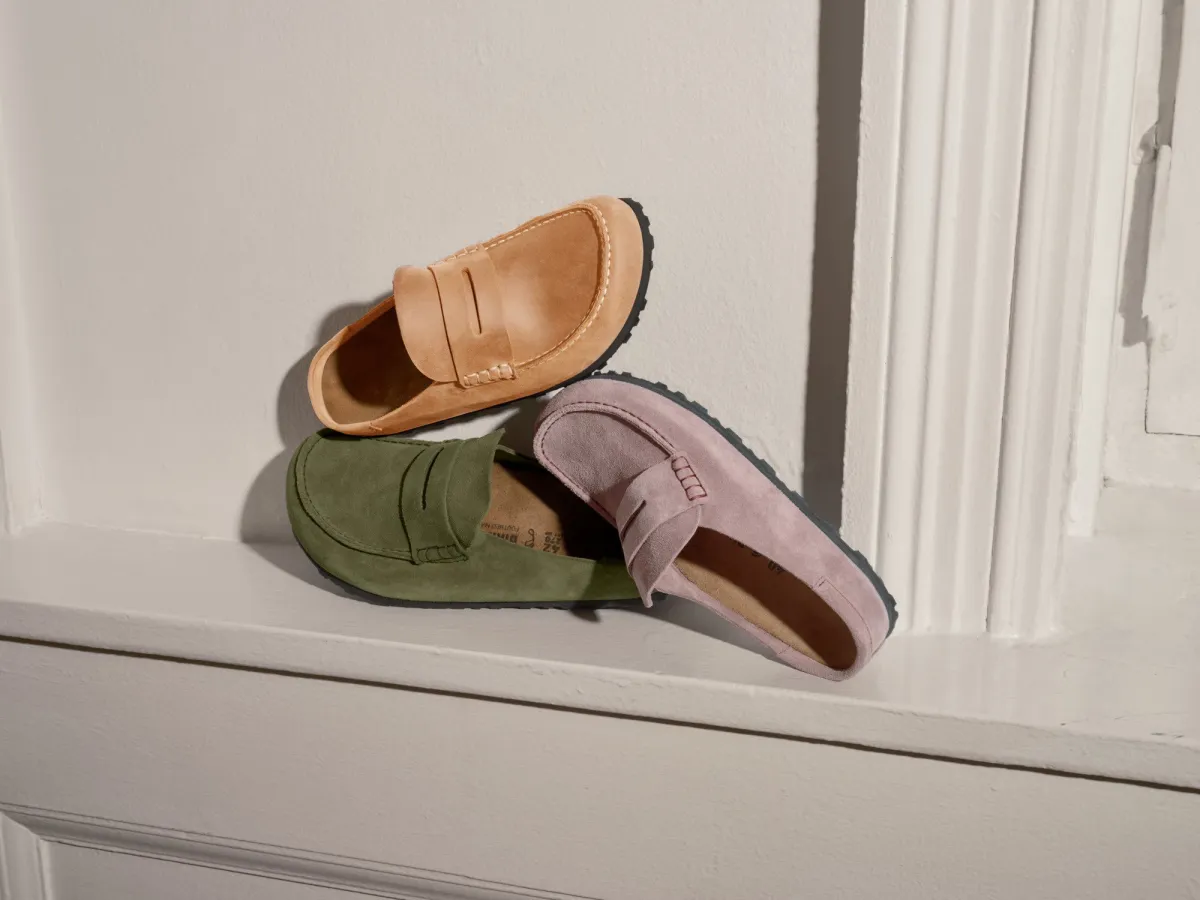 最初にご紹介するのは、オープンヒールのクロッグとモカシンを融合させた「NAPLES」。リラックス感とフォーマルな印象を併せ持つこのデザインは、柔らかいスエードやオイルドレザーを使用した新色が登場し、一層の魅力を放っています。各色ともに、同系色のステッチが施されており、BIRKENSTOCKの卓越した職人技が感じられます。