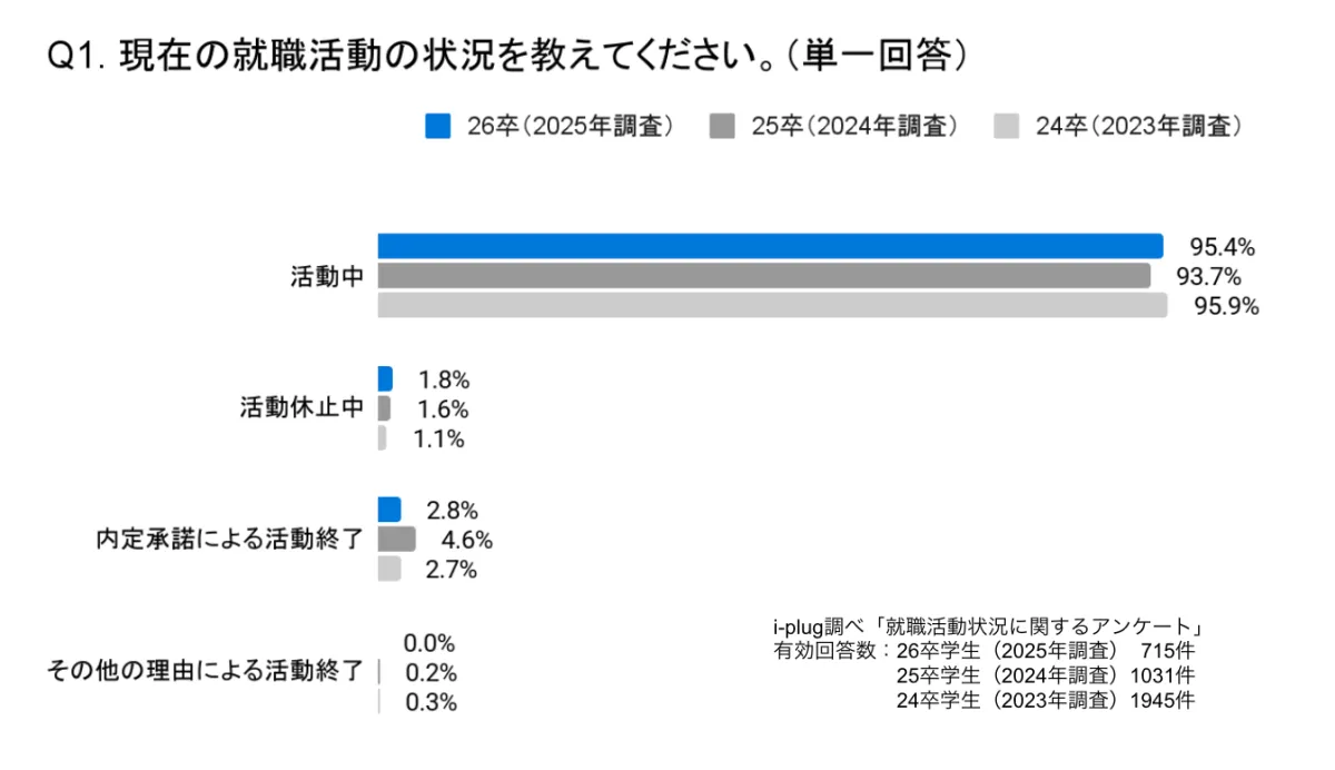 2025年1月に実施された株式会社i-plugによる「就職活動状況に関する調査」。この調査は主に2026年に卒業予定の学生を対象に行われ、総数715件の有効回答を得ています。その調査結果によると、参加者の91.1%が現在も就職活動を続けていると回答しています。およそ4人に1人が内定を持ちながら活動を継続しており、その内訳は内定通知を受けた学生や内定を承諾した学生が全体の25.6%を占めています。