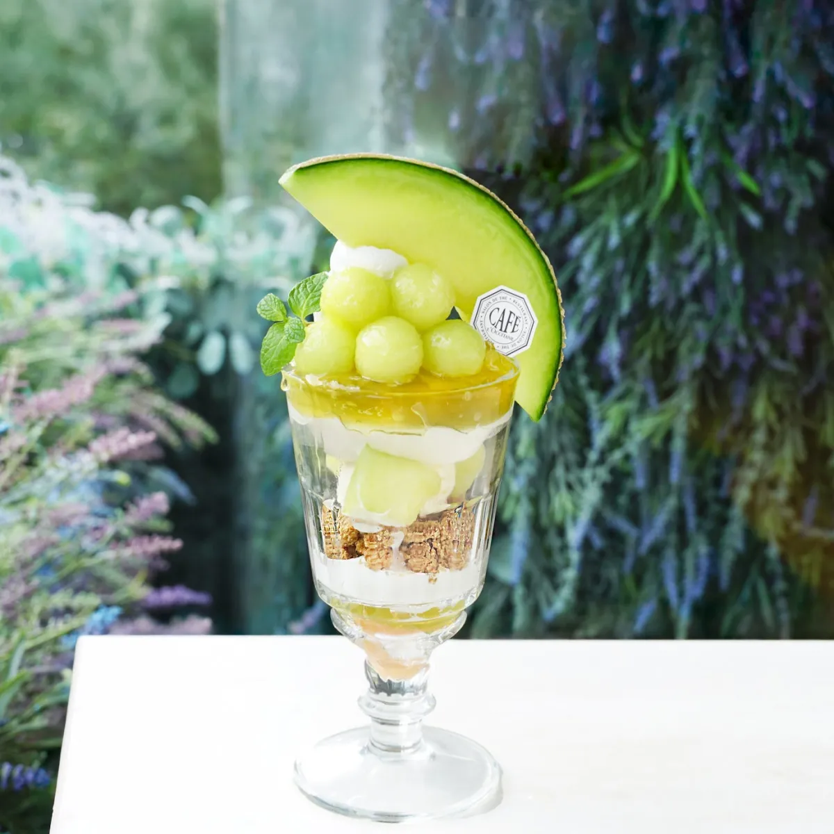 「マスクメロンのヴァーベナパフェ」。税込1,980円で味わえるこのデザートは、マスクメロンとレモンの香りを持つハーブ・ヴァーベナを組み合わせた、香り豊かな一品です。