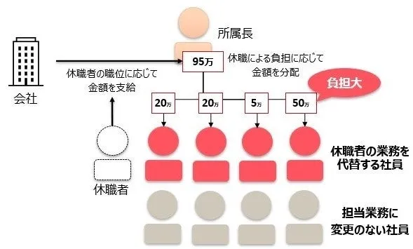 第二の施策として、育児や介護による長期間の休業を取得しやすくするために「産育介休サポート手当」が導入されます。この手当は、休職者の業務を代替またはサポートする社員に対して支給され、部長級の役職者が休暇を取得した場合、代替業務を行った社員に対して、業務負荷に応じた金額が分配されます。