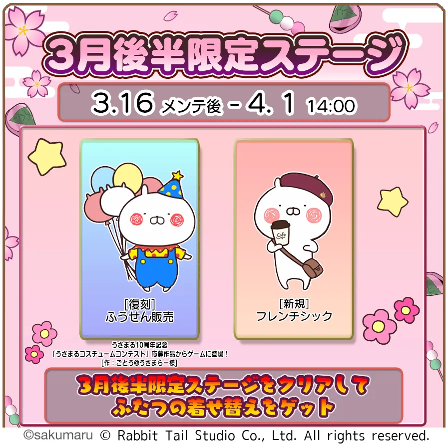 「うさまるキッチン」の3月後半限定ステージは、2026年3月16日(月)のメンテナンス後から4月1日(水)の14:00まで開催されます。このイベントを通じて、プレイヤーは新規のフレンチシックスタイルの着せ替えや、復刻版のふうせん販売の着せ替えアイテムを手に入れることが可能です。