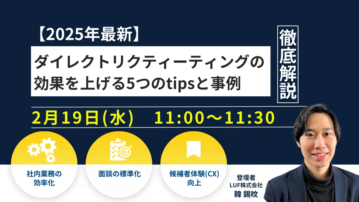 現在、多くの企業が優秀な人材を獲得するためにダイレクトリクルーティングを実施していますが、その運用方法に戸惑っている方も少なくありません。「スカウト採用を始めたいが、自社にどのような運用が必要かわからない」といった声も多く聞かれます。そこで、2025年2月19日(水)に、LUF株式会社が主催する「ダイレクトリクティーティングの効果最大化」セミナーを開催いたします。
