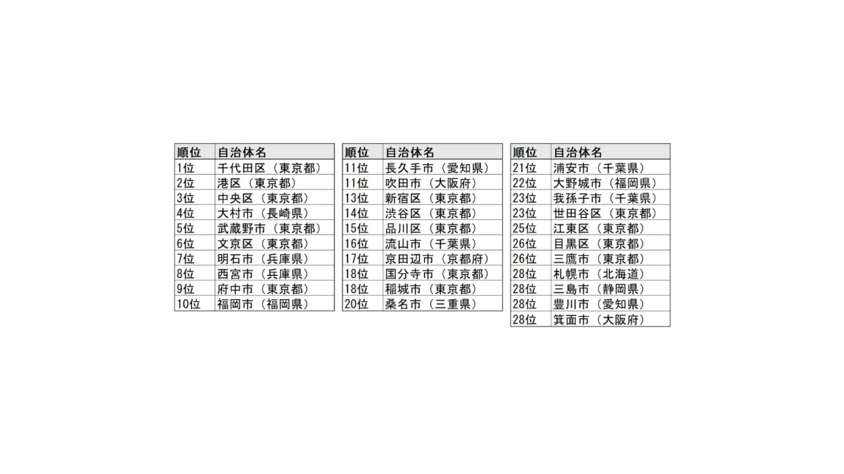東京都以外では、千葉県の3団体、愛知県、大阪府、兵庫県、福岡県がそれぞれ2団体がランキングに名を連ねました。特に千葉県は、成田市や船橋市など複数の自治体が入ったことが注目されます。