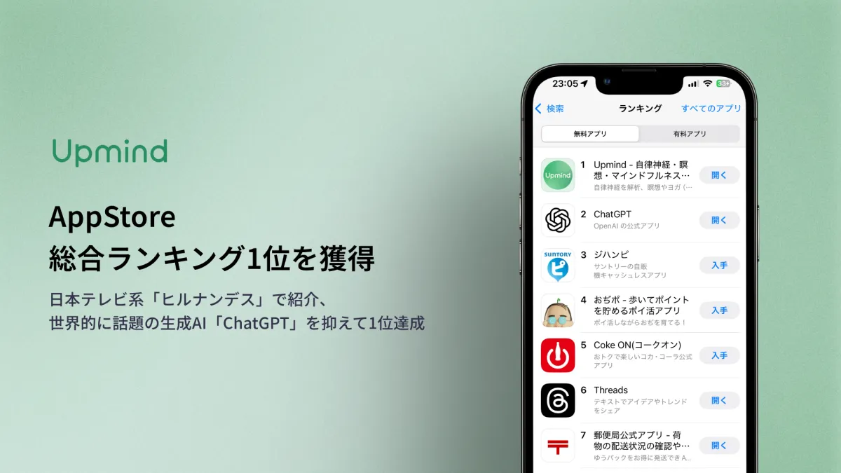 株式会社Upmindが提供するマインドフルネスアプリ「Upmind」が、2025年8月20日にAppStoreの全カテゴリーで1位に輝きました。これは、同アプリがマインドフルネス分野でも初の快挙であり、特に注目されています。これにより、アプリは将来更なる発展が期待されます。