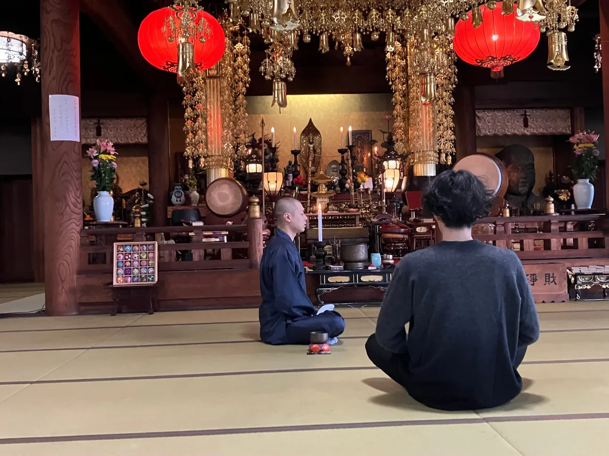静かな本堂での瞑想は、この研修のハイライトです。畳の上でのんびりと呼吸を整え、住職の導きに耳を傾ける時間は特に貴重です。スマホや日常の雑踏から離れ、心を静めることができるこの体験は、参加者に大変好評で、心身のリフレッシュに効果的です。