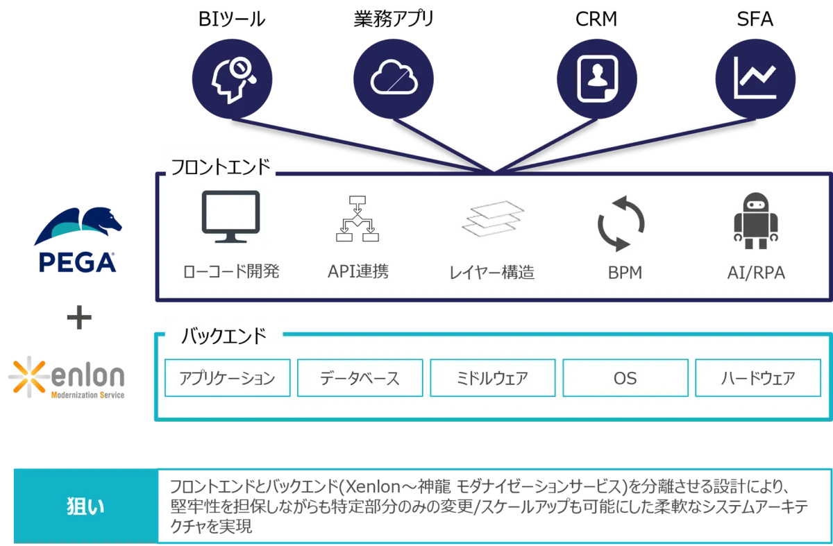 経済産業省が発表した「DXレポート」では、レガシーシステムの問題が指摘されており、これにより、多くの企業がデータ活用を妨げられています。特にCOBOL技術者の不足や、大手ベンダーのメインフレーム事業撤退がこの傾向をさらに悪化させています。このような状況の中、TISは既に「Xenlon~神龍 モダナイゼーションサービス」を通じてバックエンドのモダナイゼーションを進めてきましたが、フロントエンドにも同様のアプローチを強化する必要が生じました。そこで、TISはPegasystemsとの提携を決定し、Pega Infinityを利用してフロントエンドの柔軟性と俊敏性を高めることにしました。