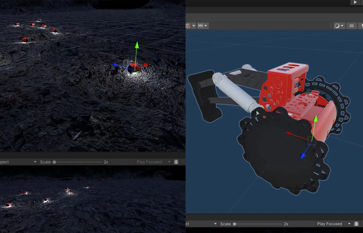 このシミュレーション環境は、Unityを用いて構築された3Dデジタルツイン技術によります。AIを搭載したロボットが、月の溶岩チューブ内での探査と基地の建設を目指し、仮想空間内での動作検証に利用されます。具体的には、以下の3つの主な用途が定義されています。