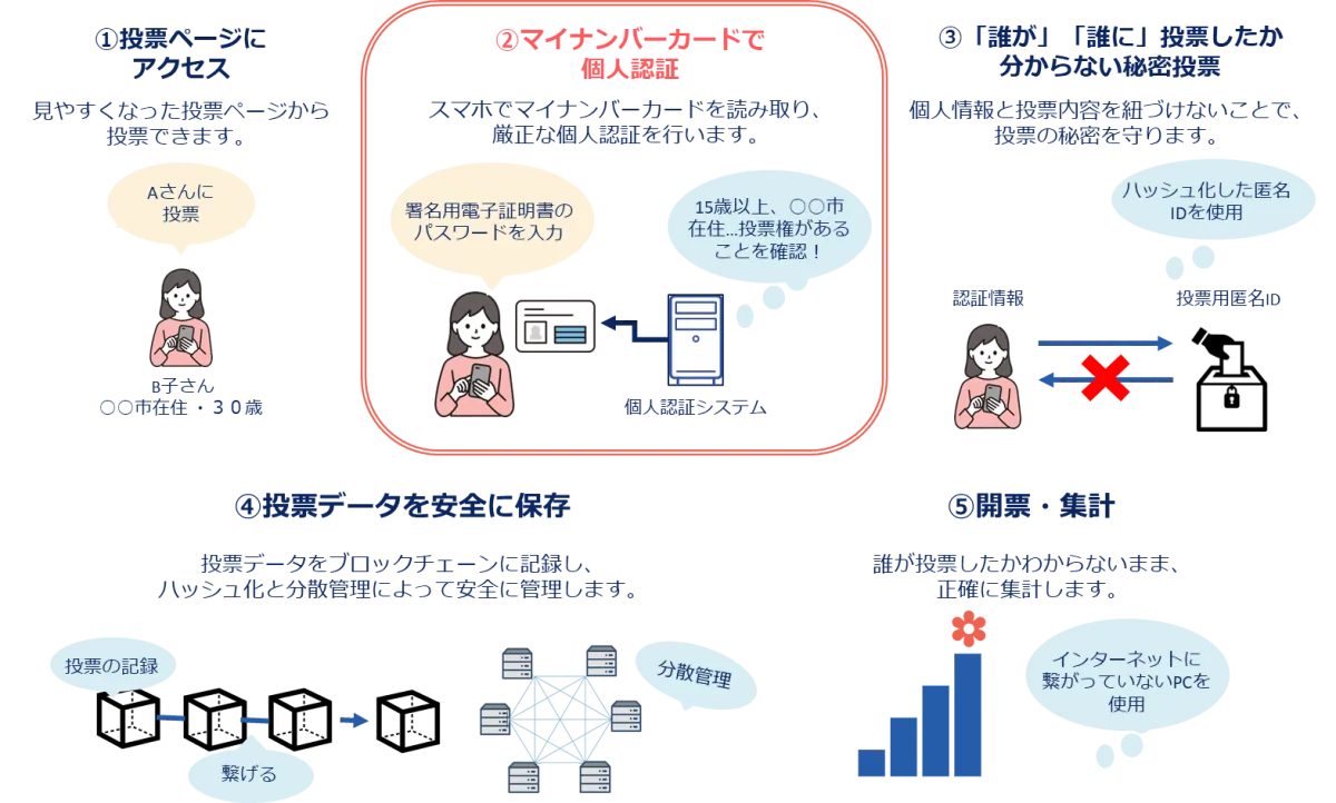 「インターネット投票システム」は、公的個人認証としてマイナンバーカードを利用し、投票において「1人1票」を厳格に実現します。さらに、ブロックチェーン技術を用いることで、投票内容の秘密保持と、データの改ざん防止を高いレベルで実現しています。これにより、透明性が高く、かつ安全な投票プロセスを提供することが可能です。