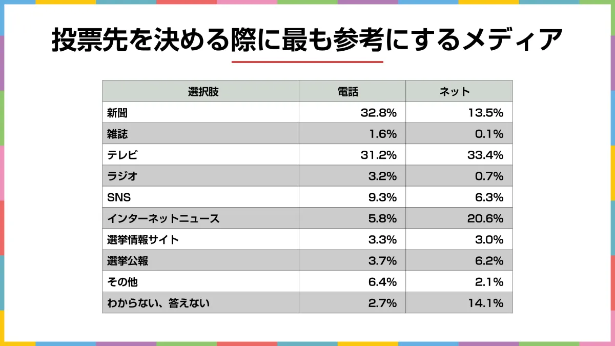 次に、投票先を決定する際に最もよく参考にするメディアについて尋ねられました。