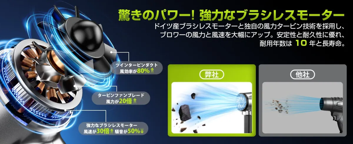 このブロワーの心臓部にあたるのは、超高速のブラシレスモーター。これにより、10センチの距離から最大1.8kgを吹き飛ばすことが可能です。まるで台風のような力を使って、水滴やホコリを瞬時に吹き飛ばすことができ、面倒な拭き取り作業が不要となります。さらには、冬季の除雪作業においても、その力は頼もしい限りです。