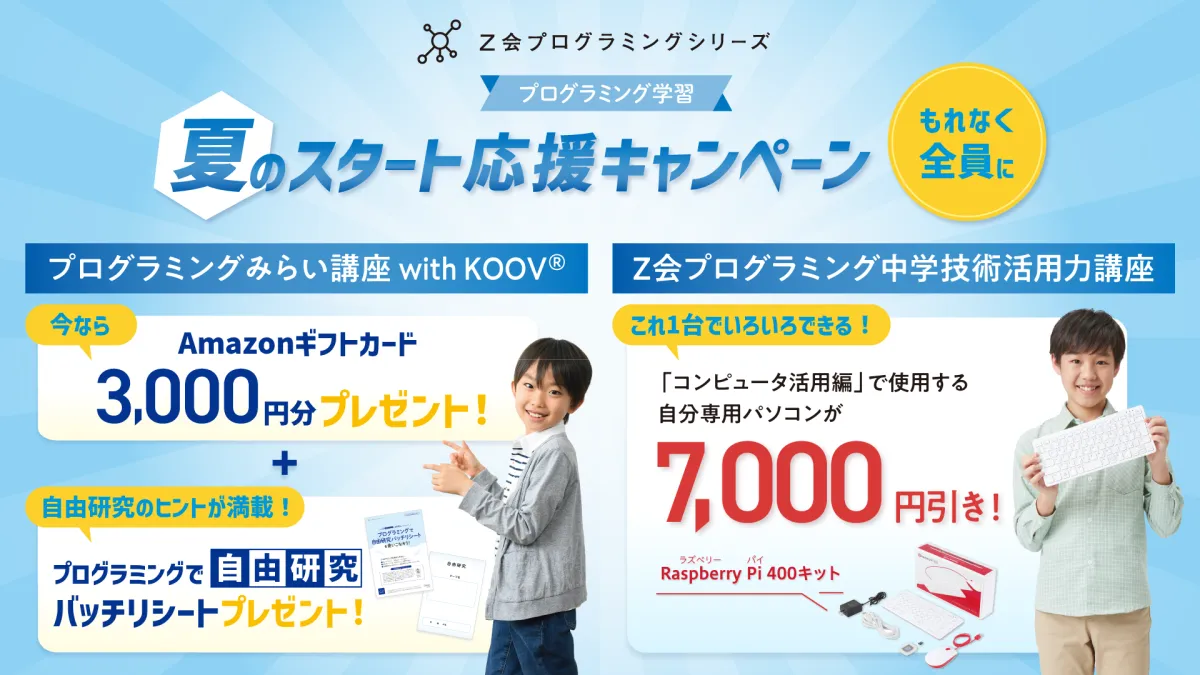夏休みは、市販の教科書に頼らず、プログラミングを学ぶのに最適な時期です。そこで、株式会社増進会ホールディングスのグループ会社、Z会が実施する「プログラミング学習夏のスタート応援キャンペーン」をご紹介します。このキャンペーンは、2025年6月12日から7月31日までの期間限定で、さまざまな特典が用意されています。