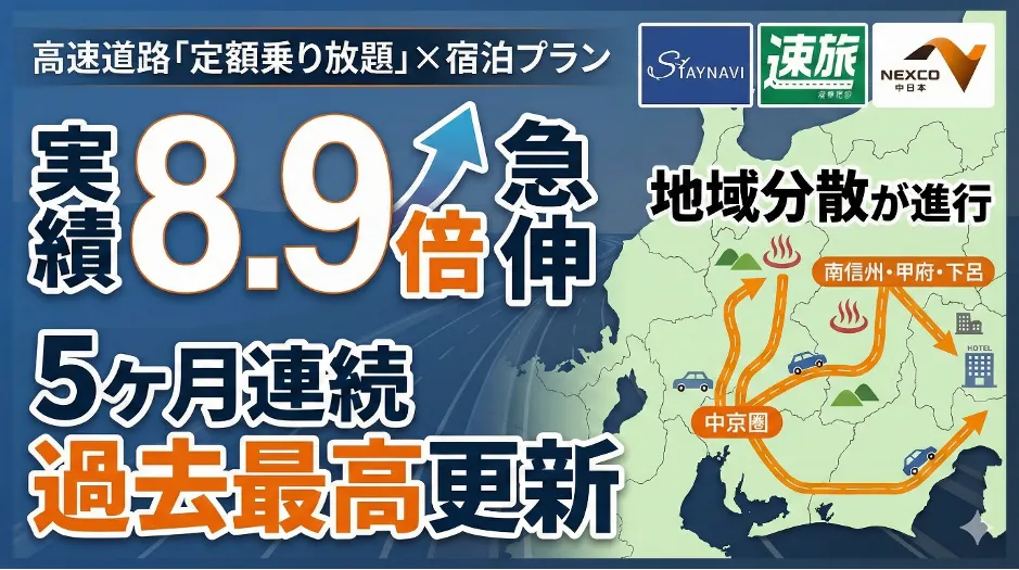 株式会社ピアトゥーがNEXCO中日本との提携で運営している、高速道路の定額乗り放題と宿泊予約がセットになった「STAYNAVI×速旅」プランが、2025年10月の実績で大きな成長を見せています。実績件数は7月比でなんと8.9倍、関連売上も7.7倍増加しており、利用者数も4.9倍といった数値を記録しています。