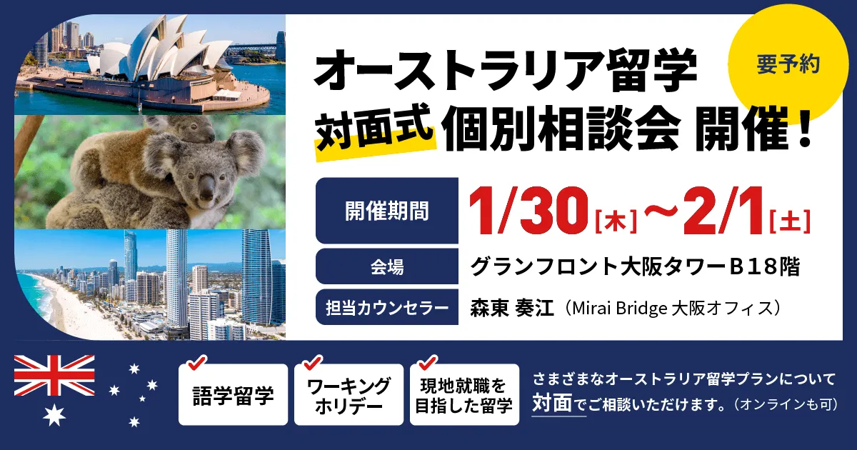 2025年1月30日から2月1日、大阪市北区のグランフロント大阪タワーBにて、オーストラリア留学を希望する方に向けた無料個別相談会が開催されます。このイベントは、留学を検討している方々が自身のニーズに応じたプランを作成するための重要な機会です。