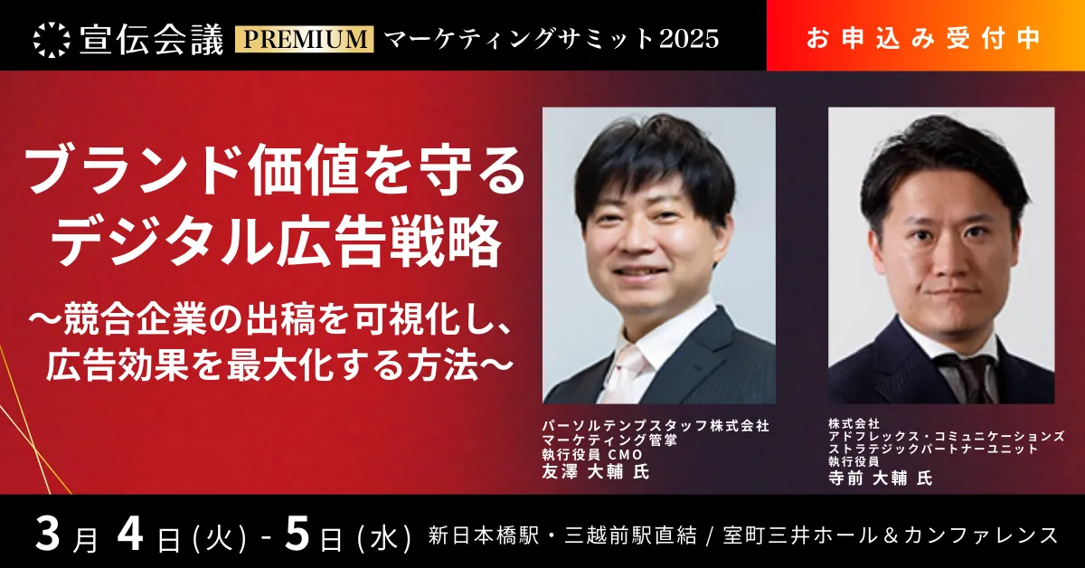 アドフレックス・コミュニケーションズは、最新のデジタル広告戦略を発表するため2025年3月4日から6日にかけて開催される「宣伝会議マーケティングサミットPREMIUM 2025」に登壇します。このサミットは、マーケティングおよびコミュニケーションの専門家が一堂に会し、最新の手法や戦略を共有する重要なイベントとして位置づけられています。アドフレックスは、そこで「ブランド価値を守るデジタル広告戦略」というセッションを展開し、企業の競争力を高めるための知見を提供します。