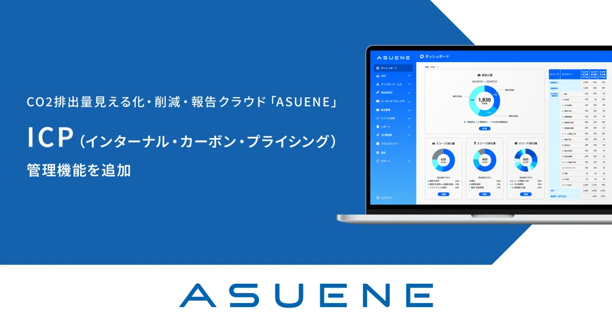 アスエネ株式会社が提供するCO2排出量の見える化・削減・報告クラウドサービス「ASUENE」に、新機能「インターナル・カーボン・プライシング(ICP)管理」が追加されました。この機能は、近年ますます注目されている企業の脱炭素経営を支援することを目的としています。
