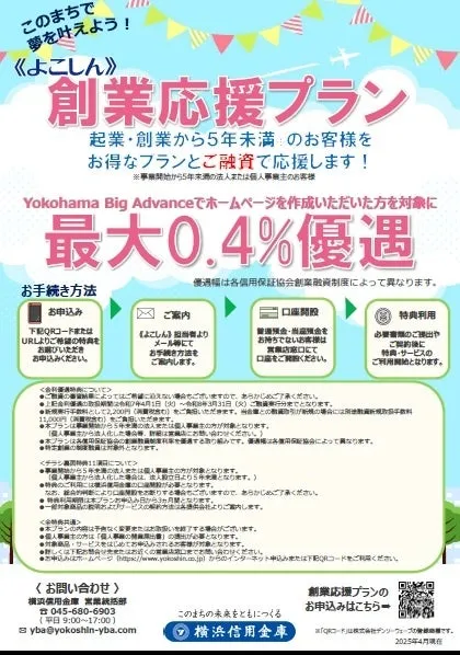 申し込みは横浜信用金庫の公式ウェブサイトまたは、配布されているチラシに付属する二次元バーコードから行うことができます。この新プランでは、各保証協会の創業融資制度金利を背景に、神奈川県と横浜市ではそれぞれ0.2%と0.4%の優遇が適用されます。